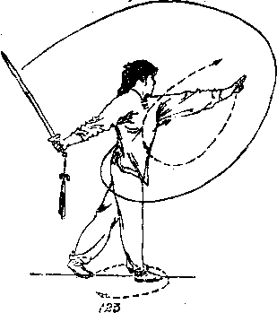 ⑤ 右脚向前上步,脚尖外摆,左脚跟离地,右手握剑 向下经体右侧向后挂起,剑尖与头同高,左臂直臂前伸,剑 指与眼同髙,虎口向上> 目视剑指(图123)。