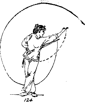 外旋,随转体贴身向下、向上、向前挂起,当右手握剑向下 离开背部时,左剑指下落,附于右腕处,随之与剑同行》目 视前方(图125)。