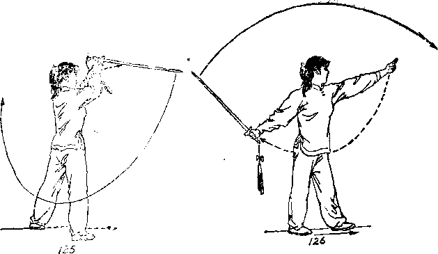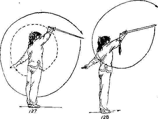 ①左脚前上步,重心前移,右脚跟离地,右手握剑 臂外旋,使虎口向上,随之以腕为轴,在臂外侧向下划立圆 绕环》目视前方(图129),