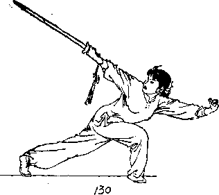 ② 右脚向前上步,屈膝,脚尖外摆,左腿伸直,脚跟 离地;右手握剑向下、向后直臂反撩,握剑手稍高于头,左 剑指向下、向前摆至体左侧> 目视剑尖(图130)。