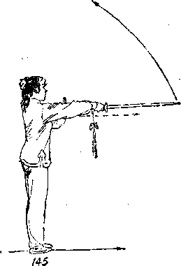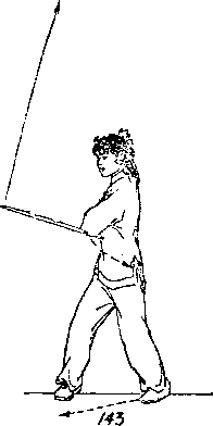③ 身体继续左转180°;右脚随转体向右上步,脚尖稍 内扣*同时右手握剑随转体屈肘下落,剑柄贴靠右腰间,手 心向上,左剑指下落,谢于右傭处I目校.剑尖(图143)。