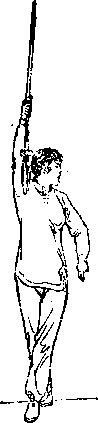 d)右脚向前进步,屈膝成弓步,右手握剑直键上#, 右臂紧靠右耳伽b剑尖向上,左剑指前伸,直臂,指尖向上>