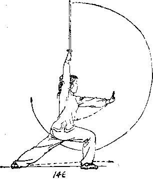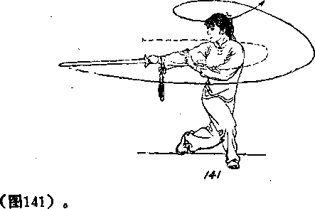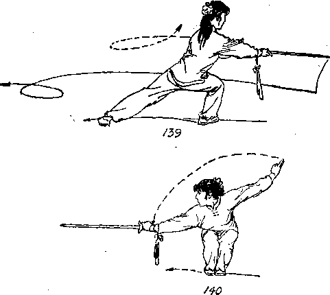 ② 身体左转180°;左脚随转体碾转半蹲,右脚向左脚内 侧并步> 同时右手握剑下落,?随转体向左直臂平扫,随之以 腕为轴,向左平绕一周,剑尖与膝同离,虎口向下,左剑指随转 体向左平摆,剑指高于头,虎口斜向下> 目视剑尖(图140)。