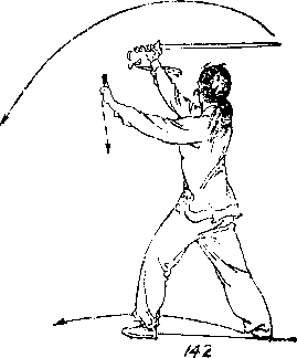 ① 身体立起,左脚向左撤步》右手握剑臂外旋,手心 向上,左剑指向右下落,附于右腕处I目视剑尖(图139)。