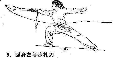 身体左转,右腿蹬直,左腿屈膝成左弓步;右手持刀,随 转身臂内旋,屈肘使刀经右腰侧向前直臂扎出,左臂内合,