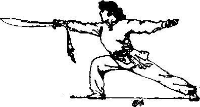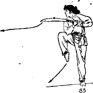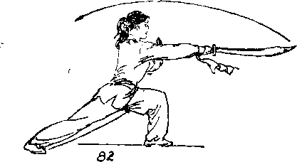 4右脚向右下落成右弓步》同时右手持刀,臂内旋, 刀刃转向下,向右直臂扎出,左臂f揮至体左侧,目视刀尖 (图84) ? ./