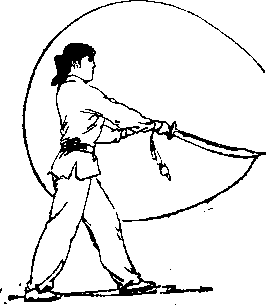 右脚筘前上步^右手持刀,臂内旋*刀在身体左侧抡一 立圃,宣臂费于右前下方,左掌仍附于右手腕处厂目视刀央 (图87) ?