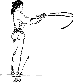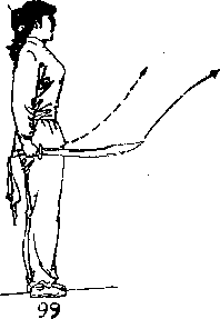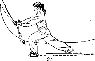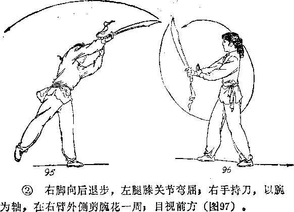 ① 身体右转,衣手持刀上绕落至体前,刀决向前上方》 目视前方(图96)。 '