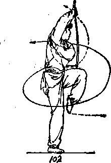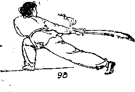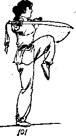 左腿屈膝上提》右竽持力,两臂内旋平分于体侧,刀抝 向右,刀尖向前> 目视前方(图101),