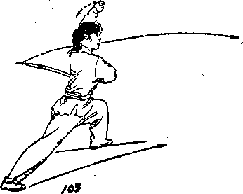 |)左細向左俞方下落成左弓步;同时右手持刀缠头,再 向左平扫藏于左腋下,刀尖向左后方,左掌弧形架于头上I 目视右前方(图103)。