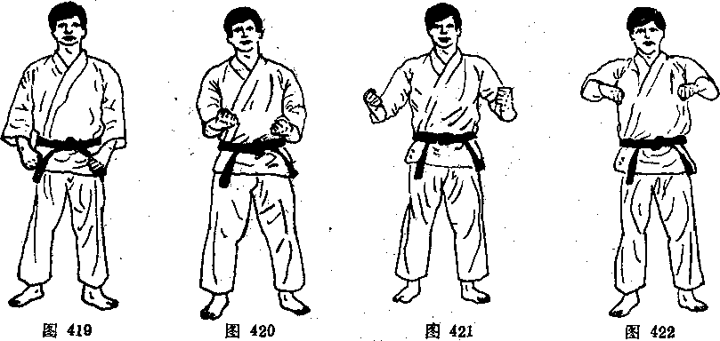 并腿式站立,双手从身体的两例向外上升,然后向前冲击(图419、420)。 腹部肌肉收缩、上体稳定后,开始冲拳,拳运行的路线为弧战。当拳运行到距离目标还有 一半路程时,前臂旋转使拳心由朝上转为朝下,这时两拳的位置从侧面距离击打目标是最 远点(见图421)。剩下的一卓路程,双拳是向里冲向攻击的部位(见图422) B在整个动作 过程中,肩下菰和上体正直是绝对必要的。双肩的移动或向一侧倾斜就会破坏平衡,并使 上肢的肌肉的稳定性也受到破坏。