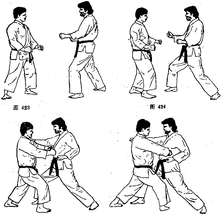图423-426展示的蟀逵整拳的基本调练后,进行高绽的剪拳训练。其练习玖自然式 站立启变为前弓式而完戒剪拳。要求剪拳和前弓式同时到位完成。