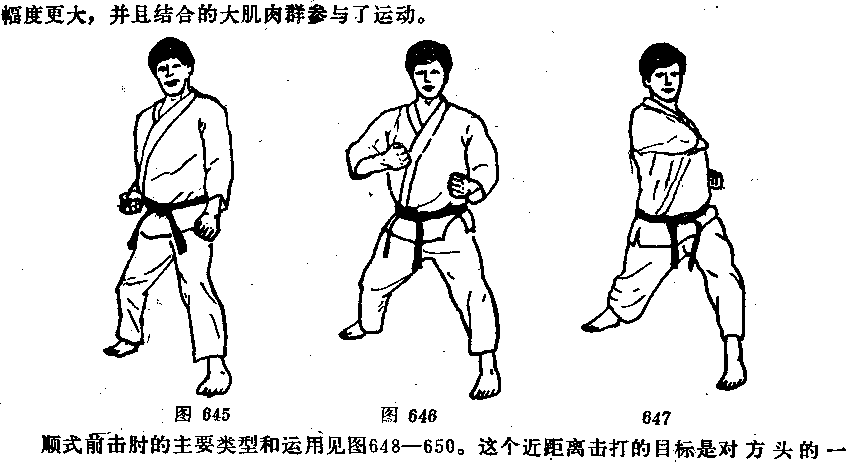 前击射的远距离运用见图651-653。由于这个距离更多实施的是掌溪、冲拳及其它奉 法,所以使用肘法常出乎对方的章料,而且能造成对手的惊旋,使自己占据优势。翊果上 步动作的各阶段都能和击打动作协调的话,那么身体脱肉的收缩为量加上本人的体重,都 将会全部融于击打之中,从而产生很强的威力。实际上,这种类型的肘法用,比起作为 空手at运动来诡,看上去更徵自卫术。’ ?'