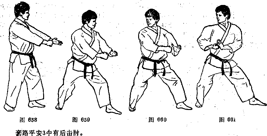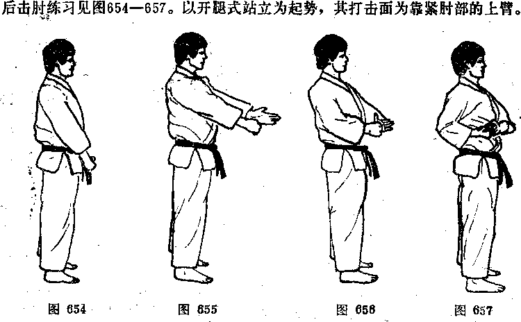 后弓式后击肘匣图658-661,其攻击力量是相当大的。这种力量产生于攻击时的转身 动作,再加上身体的重量,捷攻击更加强有力,同时也使自身保持稳定。