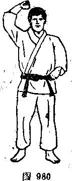 另一手臂略套曲,置于体前,见图979、980所示。从该姿势开始,以肩膀作为主要支点, 格挡手作半商周运动,快速向不劈《见图981)。前臂在与肩膀砂平处开始蝶转,使券头成 垂直位置,别达最袈位置时,将挡手臂仍弯曲《见图9&办。应拍M使动作椽0L不作费挡 的手臂回收,躯干肌肉也要紧张起癖。