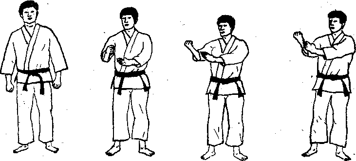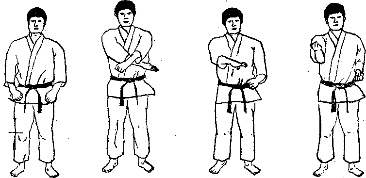 平掌向外防守练习,见图1241-1244所示。开睫式站立,将交叉的手臂放至胸前,手 掌向下。防窃结束时格挡的手位于腹腔神经丛前的位置,掌心朝上,上臂局部地触及胸 侧,肘部大约弯曲成肘距身体保持一拳之隔。