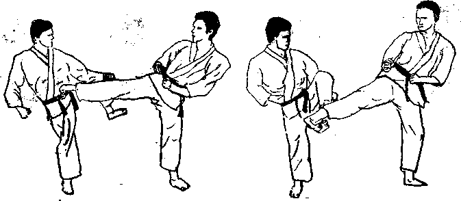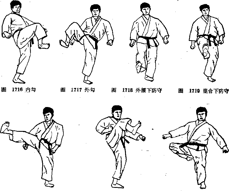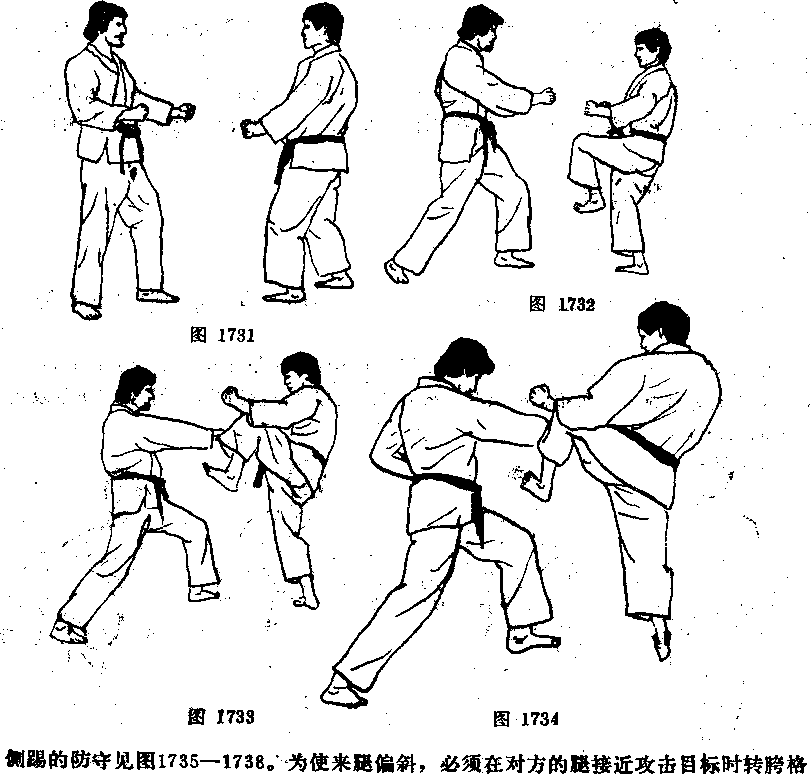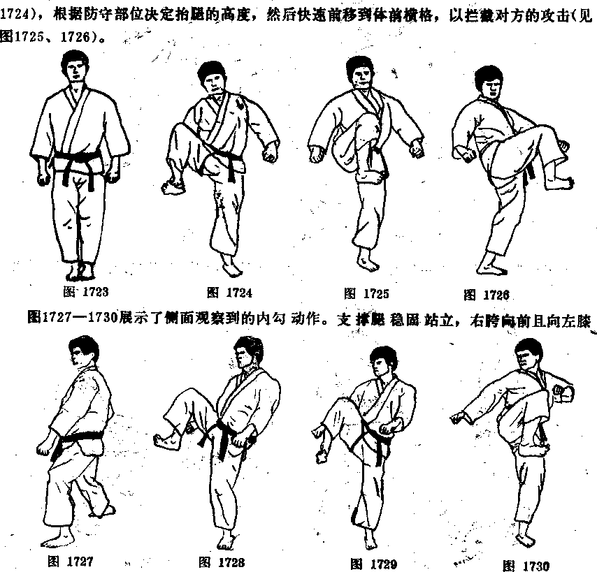 挡,正如手防守,并且使用适当的防守接触面一事实上多用踝部的内侧面,图1738中防 守腿是处于便于发动反击的理想类势。