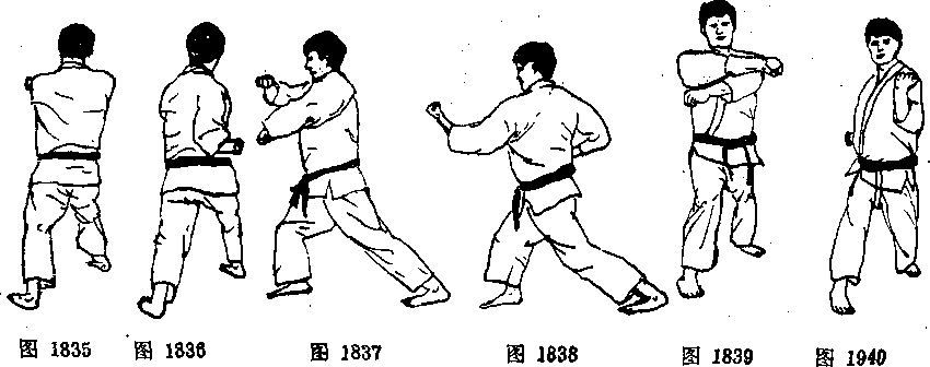 如图1835—1840,左前臂向外格挡,旋转脸部,尽可能地带动左胯向前。