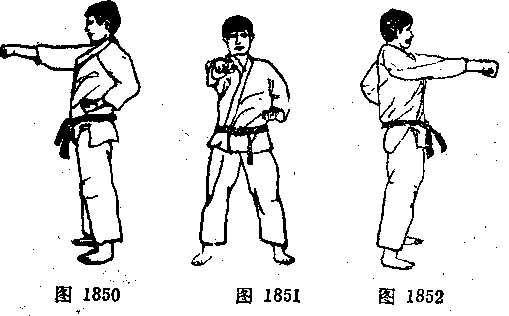 如图1850-1852,左掌变拳回收到左胯,同时右平直拳击出°