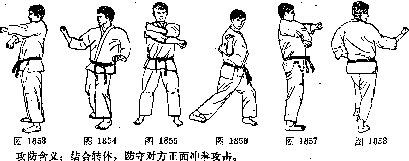 询图1853-1858,手臂交叉于身前,右臂在下,向左转体90°,同时右前臂外瓣向外格 挡。