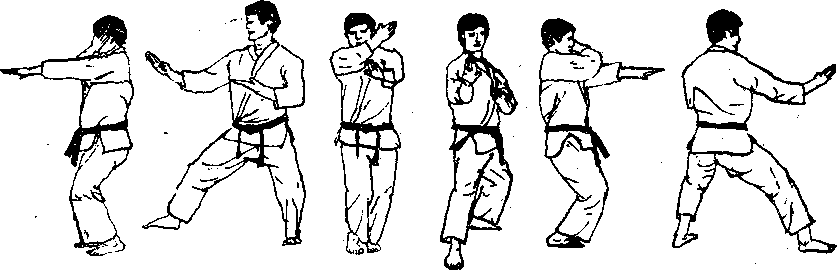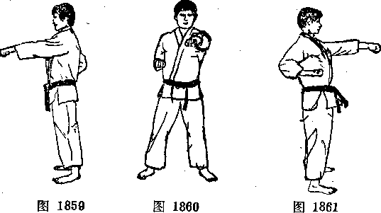 如图1859—1861*右转体,右拳回收,同时左直拳击出。