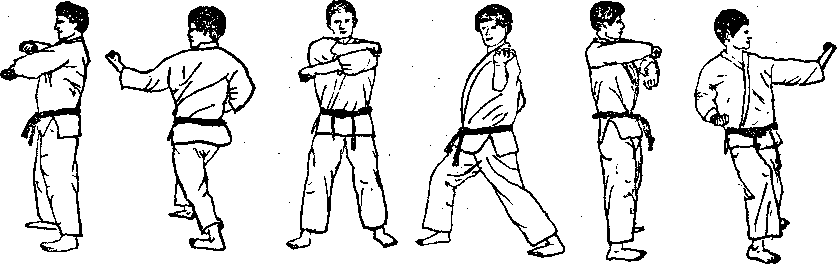 如图1862-1867:手臂交叉于身前,左臂在下,向右转体90°,同时左前臂外侧向外格 挡。