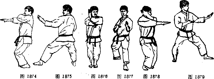 如图1874—1879:左腿向前进步,作左侧攀防守(侧掌防守I)。