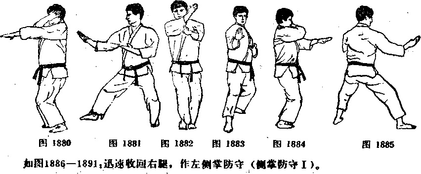 如图1880—1885^16向前进步,作右侧掌防守(侧掌鲂守I)。