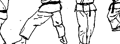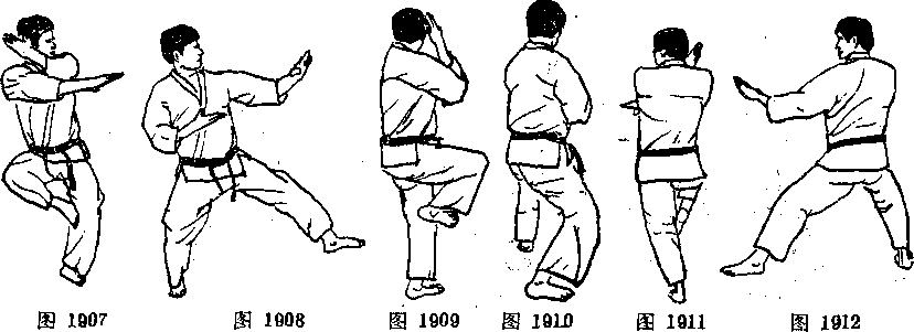 如图1907-1912:脚不落地,右脚收靠在左膝上,然后向后落地,成右后弓式,同时 完成左侧掌防守(侧掌防守I)。