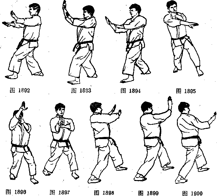 如图1892-1900;右后弓式转变成左前弓式*右掌置于左臂下,然后向前向外作抓防