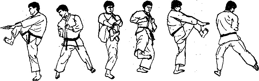 如图1901-1906,提右膝,尽可能靠紧右胸,麻后向下踩踢,同时收紧双搴至胸前。
