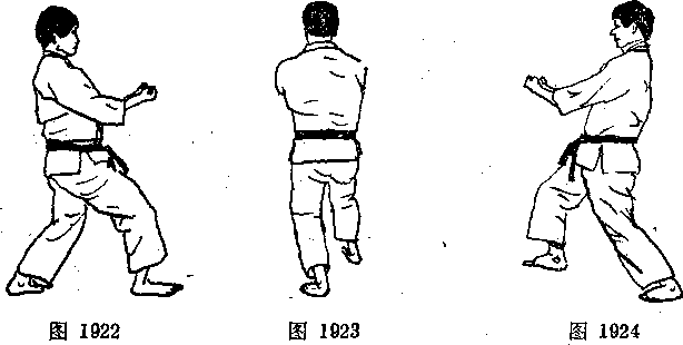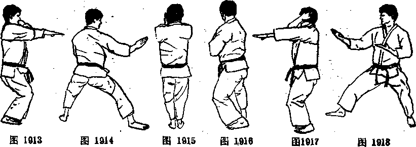 如图1913-1918,右曲向左前方进一步成左后号式;完成看侧掌防守。