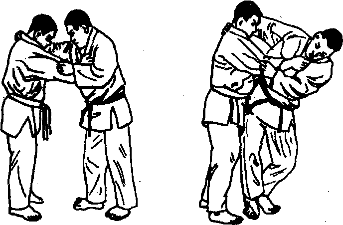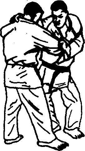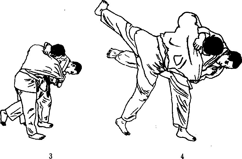 右腿插入对手裆内,大腿根和臀部紧贴住对手小腹处,右腿 向后上方挑起时,同时低头向左转脸。