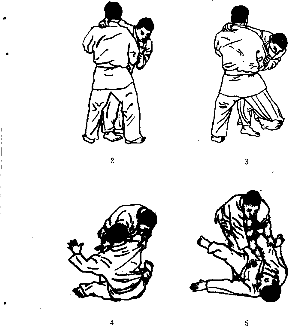 左手抓对手的右上袖把,右手抓其左上领襟把,右足上步 (图D;两手把向前拉,左背步(图2);右腿插进对手裆内(图 3);右腿向后上方挑起并低头向左转体,迫使对手从右腿上翻倒 下去(图4)。