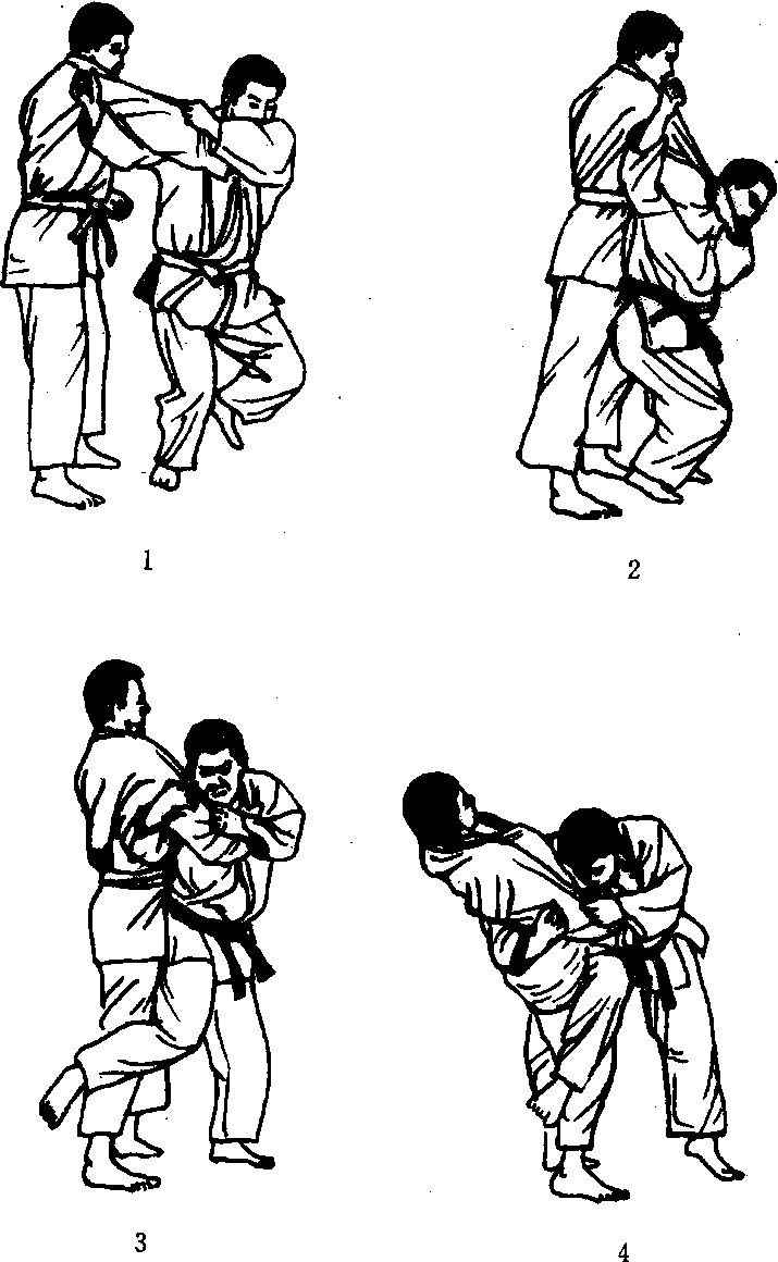 左手抓对手的右中袖把。右手插入其右腑下往上抬起(图 D;一本背负投时受到阻力摔不出时(图2):身体右侧过来并用 右腿绊对手的右腿侧面(图3);身体向前并用右胸肩压对手的 右胳膊,用大外落摔倒对手(图4)。