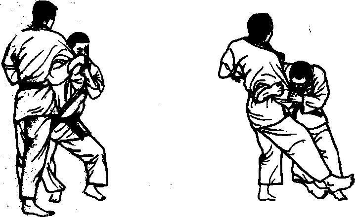 当一本背负投摔不出去时,身体右转90。时,双手抱住对手 右胳膊往下拉,迫使对手身体重心落在右足上或平均落在两足, 然后迅速用右足弓扫踢对手右足跟折其支撑点而倒下。