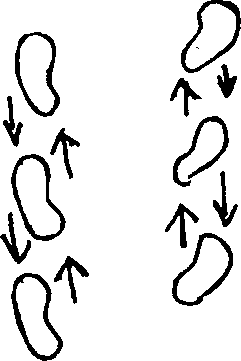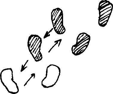 以右自然体站立姿势开始,先迈右脚,左脚跟着前进1步一,仍保持行 脚在前左脚在后的身体姿势和两脚距离;依照右脚在前,左脚在后跟进的 方法前进,