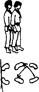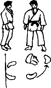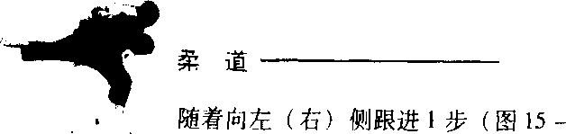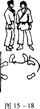 以自然体站立姿势开始,双方面对面站立,一方以右脚先向右前方迈 1步,左脚跟着再迈1步的顺序,向对方左脚前直角的位置上移步 (图 15-15)。
