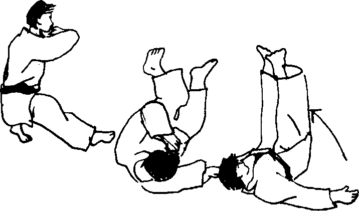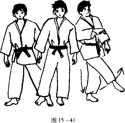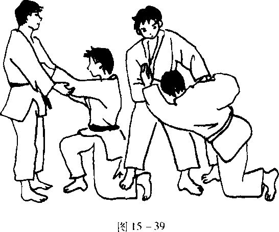 ④一方用蹲踞姿势,利用对方从侧面轻轻的推力练习侧倒(图15-39).