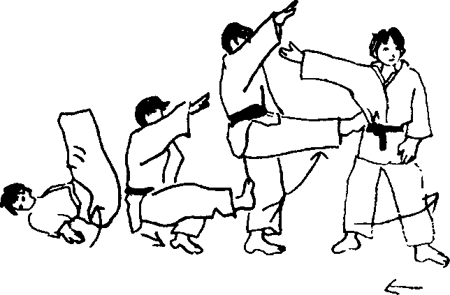 ③右腿、右手同时向左斜前方摆起。用站立侧倒的动作,进行倒地 (图 15 -41),