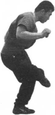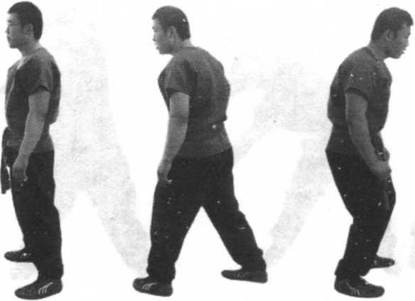 方法:空作揣、入的动作,可用多种步法,如用背步、盖步、卧 步等在最后发力时,入是向侧发力,揣是向正前方躬身发力,其中一 手在体侧做挡的动作。(图36)