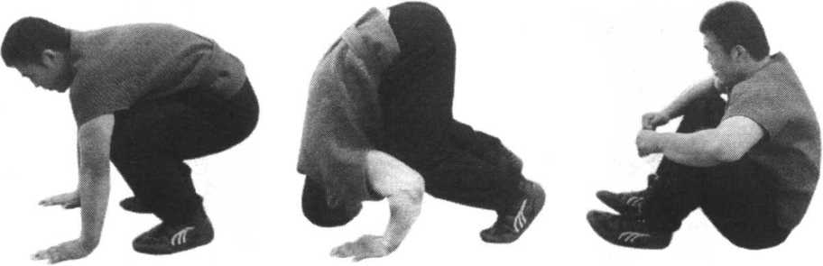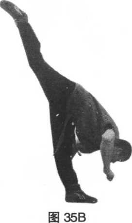 方法:由盘腿耗桩接着做扔空动作,即按照勾、别动作的要求空 作,左右腿交替做,扔左腿左臂作上手,右手作底手。(图35)
