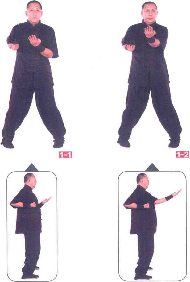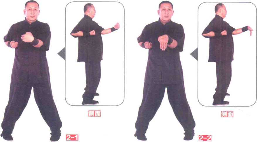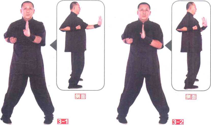 动作步骤接上部动作。左拳变摊手紧贴胸侧出至胸前归时随即左手沿中线向前慢慢顶1出至肘部离身体一拳距离。(图1-1、1-2)仁生司左摊7变圈下以左腕外侧为力点由内向外圈出做顺时针转半周。(图2-1、2-2)3当圈手至中线立即翻上变护手腕内侧极力向内收然后缓缓以肘力将护手沿中线拉网距胸前一拳的位置(图3-1、3-2)