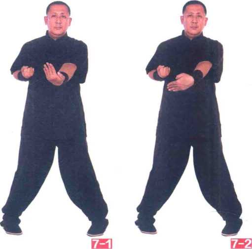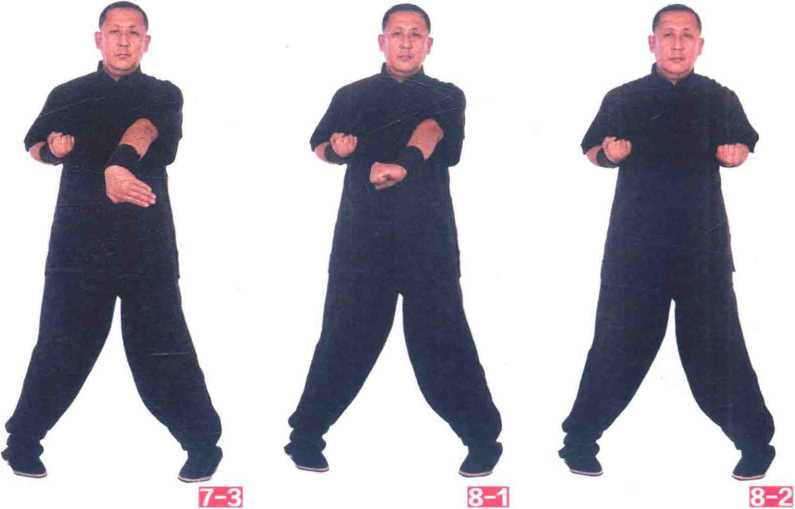 掌变拳屈肘回抽收至胸两侧腋下。(图8—1、8—2)