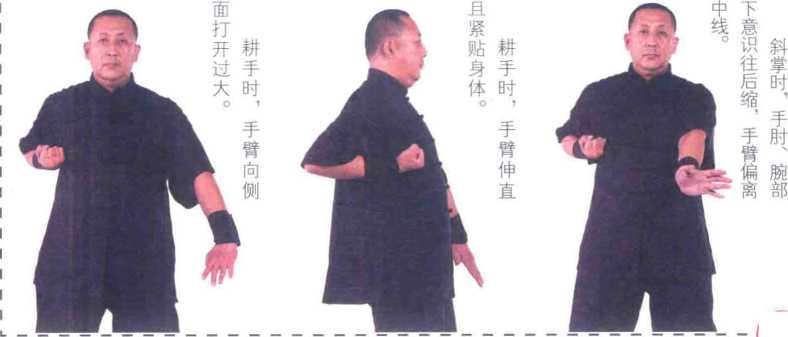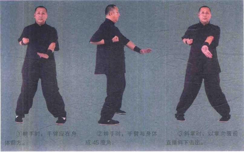 左手以左腕外侧为力点由内向外圈出成半圈手(图4一1、4-2)左手肘部发劲以腕内侧为力点,沿斜直线向打出成斜掌
