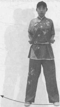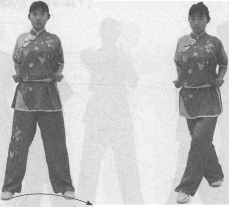 开步站立;两拳抱于腰间(图6-54 )。右脚提起,经左脚后左侧横迈一步, 脚前掌着地,两腿交叉,重心偏于左腿(图6-55)。