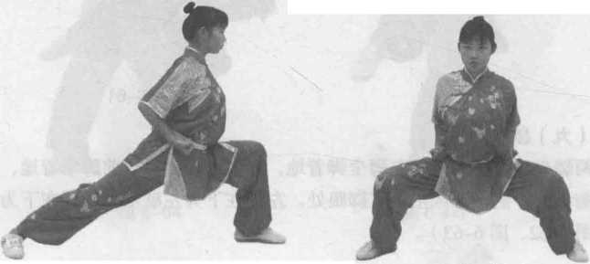 一腿向前方迈出一大步,约为脚长的4 ~ 5倍,同时膝关节弯曲,大腿 近于水平膝盖与脚尖垂直。另一腿挺膝伸直。两脚全脚掌着地,上体正对前方。 左腿在前为左弓步,右腿在前为右弓步(图6-56)。