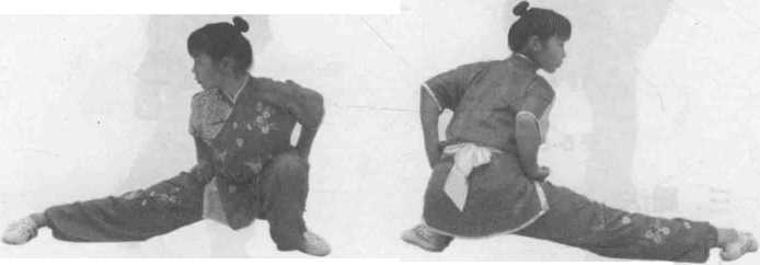 图 6-58图 6-59两腿左右分开,两脚距离约脚长的4 ~ 5倍,一腿屈膝全蹲,膝部与脚 尖外展;另一腿伸直平仆,接近地面。两脚全脚掌着地(图6-58、图6-59)。 左腿伸直为左仆步,右腿伸直为右仆步。