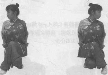 两腿交叉靠拢全蹲,左脚全脚着地,脚尖外展,右脚前脚掌着地,膝部 靠于前小腿外侧,臀部接于右脚跟处。左腿在下为左歇步,右腿在下为右歇 步(图 6-62、图 6-63 )。