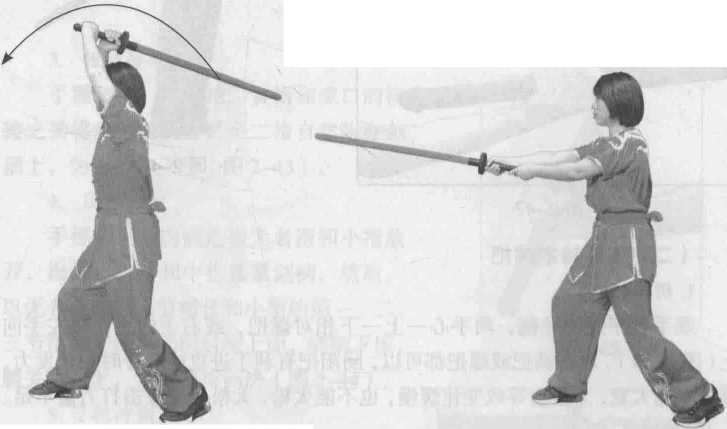 1.劈:提劲力达剑身中部,双手握剑,由上向下为劈。分为左劈、右劈、 前劈、后劈、斜劈。虎口向前。技击:用于攻击对方头面部、颈部(图2-52、 图 2-53 )。